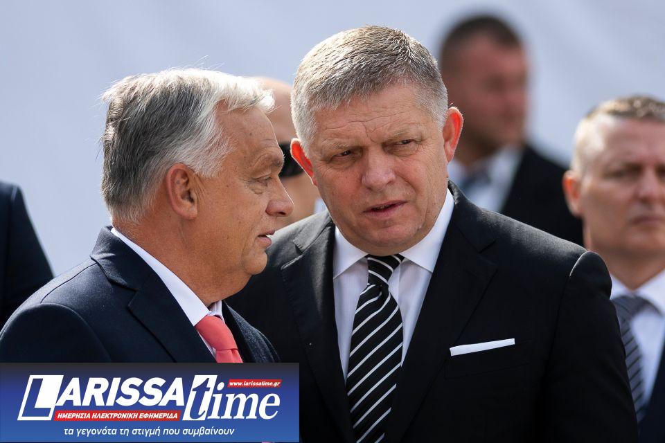 Ο πρωθυπουργός της Σλοβακίας Ρόμπερτ Φίτσο (δεξιά) μιλάει με τον πρωθυπουργό της Ουγγαρίας Βίκτορ Όρμπαν