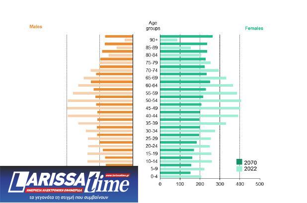Το ακόλουθο γράφημα δείχνει τη σύγκριση της ηλικιακής πυραμίδας μεταξύ 2022 και 2070 για άνδρες και γυναίκες.