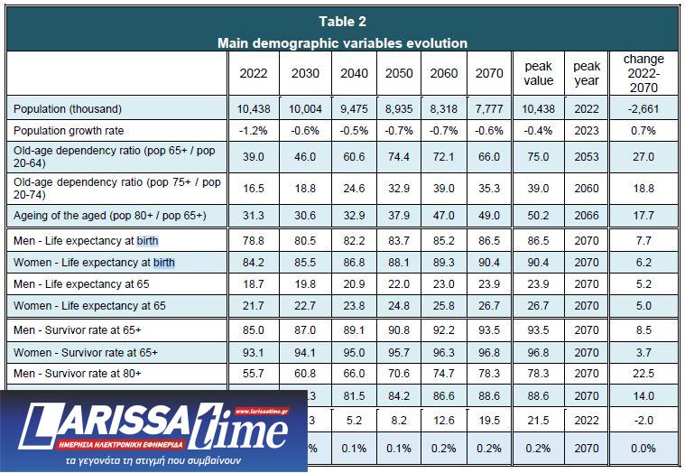 Η εκτίμηση για την εξέλιξη των κύριων δημογραφικών μεταβλητών παρουσιάζεται στον ακόλουθο πίνακα. Ο πληθυσμός , όπως προβλέπεται από τη EUROSTAT, μειώνεται από 10,438 εκατομμύρια το 2022 σε 7,777 εκατομμύρια το 2070.