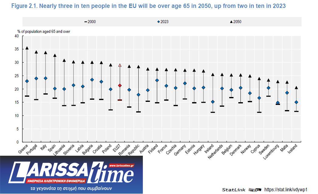 Μέχρι το 2050, ο πληθυσμός των ατόμων ηλικίας άνω των 65 ετών αναμένεται να παρουσιάσει σημαντική αύξηση σε Ιταλία, Πορτογαλία Ισπανία και Λιθουανία. Η Ελλάδα, σύμφωνα με τα στοιχεία του ΟΟΣΑ, θα αναδειχθεί «πρωταθλήτρια» με τουλάχιστον το ένα τρίτο του πληθυσμού (35%) σε αυτή την ηλικιακή ομάδα.