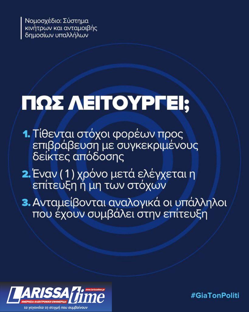 · Πρόκειται για ένα νέο σύστημα επιβράβευσης των δημοσίων υπαλλήλων για την ουσιαστική συμβολή τους στην επίτευξη προσδιορισμένων και μετρήσιμων στόχων, απόλυτα συνδεδεμένο με το υφιστάμενο σύστημα στοχοθεσίας – αξιολόγησης και με τα Ετήσια Σχέδια Δράσης των Υπουργείων.