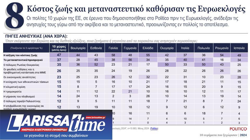 Οι πολίτες 10 χωρών της ΕΕ, σε έρευνα που δημοσιοποιήθηκε στο Politico πριν τις ευρωεκλογές, ανέδειξαν τις ανησυχίες τους γύρω από την ακρίβεια και το μεταναστευτικό.