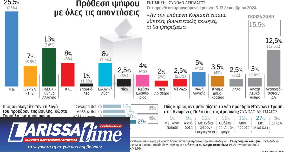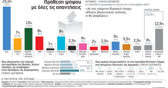 Το «σοκ» των ευρωεκλογών εξακολουθεί να επιδρά σε σχεδόν όλα τα κόμματα που προσπαθούν να βρουν τον βηματισμό τους. Αναιμική άνοδο 0,5% στην πρόθεση ψήφου καταγράφει η νέα έρευνα της Pulse για λογαριασμό του ΣΚΑΪ σε Νέα Δημοκρατία (25,5%) και ΣΥΡΙΖΑ (7%) σε σχέση με τον Δεκέμβριο, ενώ το ΠΑΣΟΚ, ενδεχομένως επηρεασμένο από τα θολά μηνύματα περί συνεργασιών, χάνει μία μονάδα πέφτοντας στο 13%. Το ΚΚΕ παραμένει σταθερό στο 8%. Στο δεξιό φάσμα της πολιτικής γεωγραφίας, η επαναφορά του Τραμπ στον Λευκό Οίκο φαίνεται πως βοήθησε δυνάμεις όπως η Ελληνική Λύση (8%) και η Φωνή Λογικής (5%) να ανέβουν κατά μισή και μία μονάδα αντίστοιχα. Η Νίκη καταγράφεται στο 2,5% και το φράγμα του 3% ξεπερνούν η Πλεύση Ελευθερίας (4%) και το Κίνημα Δημοκρατίας (3,5%). Η «γκρίζα ζώνη» των πολιτών που δεν έχουν καταλήξει αποτυπώνεται στο 15,5%. Η εικόνα κατακερματισμού του πολιτικού σκηνικού δεν αλλάζει, καθώς στην εκτίμηση ψήφου με σενάριο κατανομής των αναποφάσιστων 10 κόμματα βρίσκονται πάνω από το όριο εισόδου στη Βουλή.