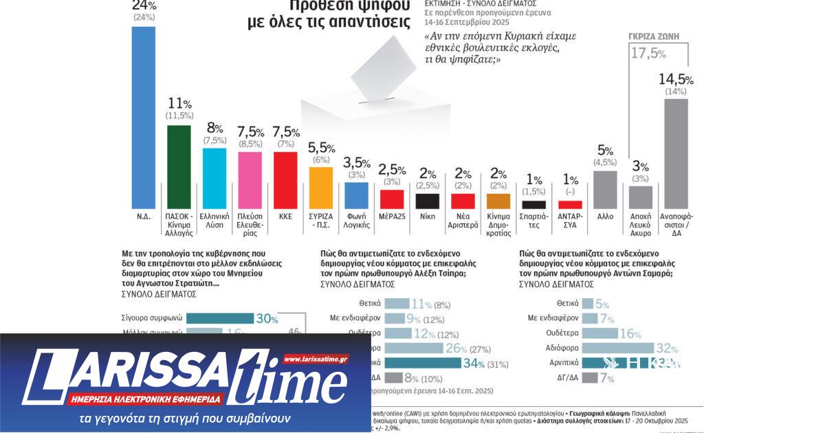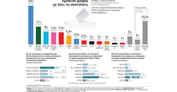 Μόνο κάποιες μικρές αυξομειώσεις καταγράφουν τα κόμματα στη δημοσκόπηση της Pulse που διενεργήθηκε για λογαριασμό του ΣΚΑΪ, με το πολιτικό σύστημα να τηρεί στάση αναμονής και να δείχνει επηρεασμένο από την έντονη φημολογία δημιουργίας κόμματος από τους Αλέξη Τσίπρα, Αντώνη Σαμαρά και Μαρία Καρυστιανού. Το ΠΑΣΟΚ αδυνατεί να εκμεταλλευθεί την ακρίβεια στην αγορά και την αναταραχή που έχουν προκαλέσει στην κυβέρνηση η τροπολογία για το Μνημείο του Αγνωστου Στρατιώτη και η Εξεταστική για τον ΟΠΕΚΕΠΕ, χάνοντας μισή μονάδα σε σχέση με τον προηγούμενο μήνα. Καταγράφεται στο 11%, με τη Νέα Δημοκρατία να παραμένει σταθερή στο 24%. Τρίτη δύναμη έχει περάσει πλέον η Ελληνική Λύση με 8% (+0,5%), ενώ η Πλεύση Ελευθερίας χάνει επιπλέον δυνάμεις και βρίσκεται στην τέταρτη θέση με 7,5% (-1%). Στο ίδιο ποσοστό αποτυπώνεται το ΚΚΕ που κερδίζει 0,5% σε σχέση με τη μέτρηση του Σεπτεμβρίου. Ο ΣΥΡΙΖΑ μετά την παραίτηση του Αλέξη Τσίπρα από το βουλευτικό αξίωμα μετριέται στο 5,5% (-0,5%). Στο 3,5% (+0,5%) βρίσκεται η Φωνή Λογικής. Ακολουθούν με πτώση μισής μονάδας το ΜέΡΑ25 και η Νίκη, με 2,5% και 2% αντίστοιχα. Στο 2% παραμένουν χωρίς μεταβολή η Νέα Αριστερά και το Κίνημα Δημοκρατίας, στο 1% (-0,5%) οι Σπαρτιάτες, ενώ στη μονάδα καταγράφεται και η ΑΝΤΑΡΣΥΑ. Η γκρίζα ζώνη παραμένει σε υψηλά επίπεδα, στο 17,5% (+0,5%).
