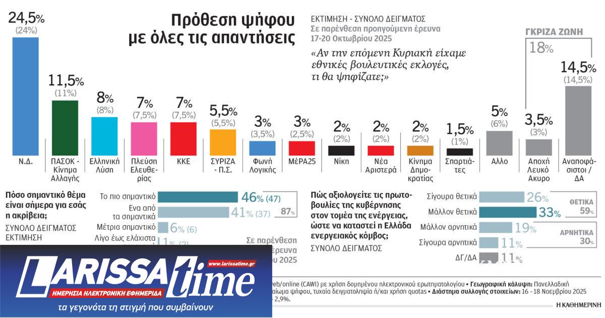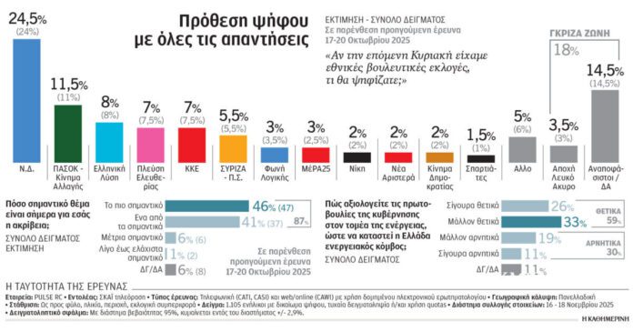 Οι σημαντικές πρωτοβουλίες στον τομέα της ενέργειας και το καλό επίπεδο συνεργασίας με τον αμερικανικό παράγοντα φαίνεται πως βοήθησαν την κυβέρνηση να ξεκολλήσει λίγο τη «βελόνα» στη δημοσκόπηση της Pulse που πραγματοποιήθηκε για λογαριασμό του ΣΚΑΪ. Στην πρόθεση ψήφου η Νέα Δημοκρατία κερδίζει μισή μονάδα σε σχέση με ένα μήνα πριν και φθάνει στο 24,5%, διατηρώντας απόσταση ασφαλείας από το δεύτερο ΠΑΣΟΚ. Το κόμμα του Νίκου Ανδρουλάκη αποτυπώνεται στο 11,5% και ανεβαίνει επίσης κατά 0,5%. Η διαφορά μεταξύ τους παραμένει διψήφια, στο 13%.