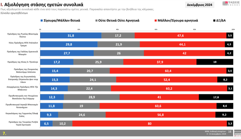 Μία από της ερωτήσεις η οποία τέθηκε, ήταν πως αξιολογούν οι ερωτώμενοι συνολικά τους εξής 11 ηγέτες: Βλάντιμιρ Πούτιν, Ντόναλντ Τραμπ, Εμανουέλ Μακρόν, Σι Τζινπίνγκ Βολοντίμιρ Ζελένσκι , Ούρσουλα φον ντερ Λάιεν, Τζο Μπάιντεν, Κιρ Στάρμερ, Μπενιαμίν Νετανάχιου, Όλαφ Σολτς και Ρετζέπ Ταγίπ Ερντογάν.