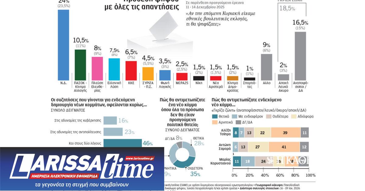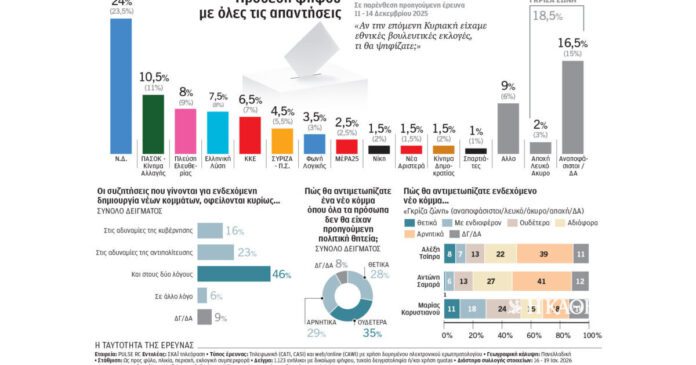 Μισή μονάδα κερδίζει στην πρόθεση ψήφου η Ν.Δ. και φτάνει στο 24% – Μικρή πτώση για ΠΑΣΟΚ, Πλεύση Ελευθερίας, Ελληνική Λύση.