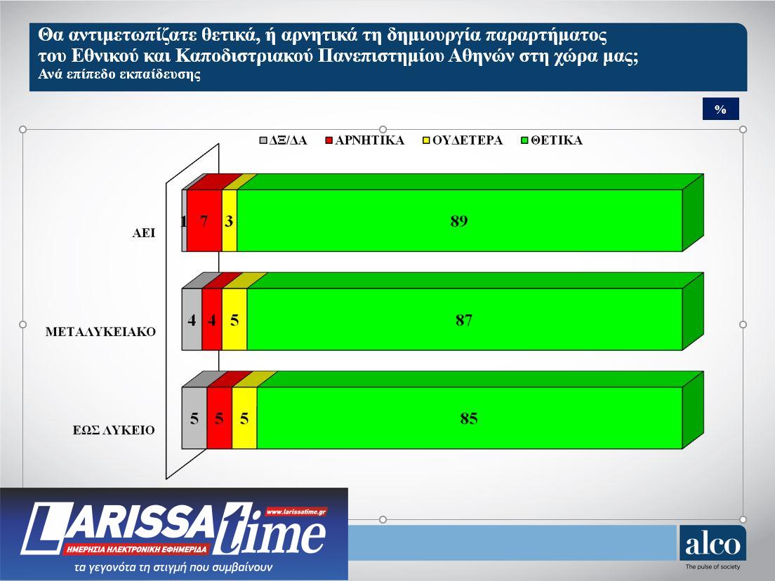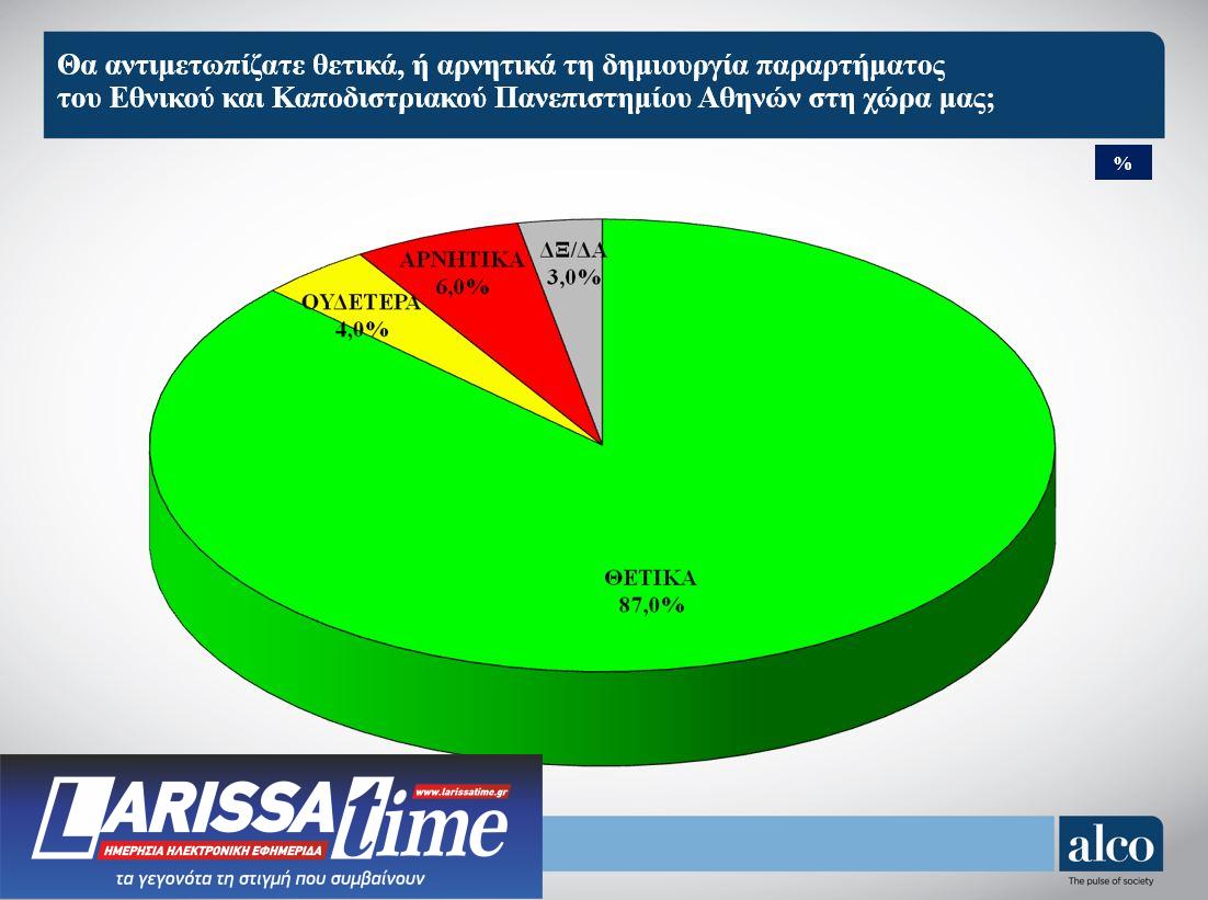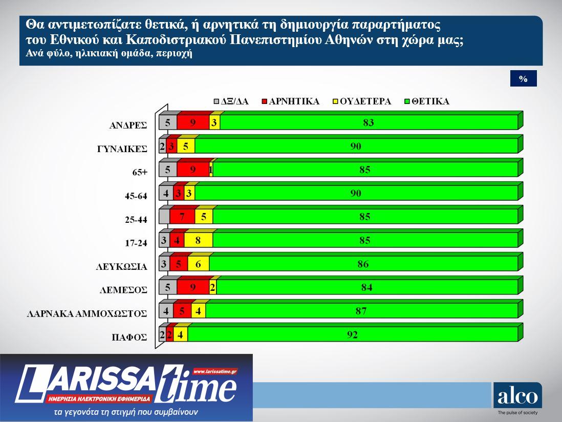 Το ίδιο υψηλά θετικά είναι η εκτίμηση και όταν το ερώτημα έρχεται στο ΕΚΠΑ και την προοπτική δημιουργίας παραρτήματός του στην Κύπρο. 87% των ερωτηθέντων τοποθετούνται θετικά και μόλις 6% τοποθετούνται αρνητικά.