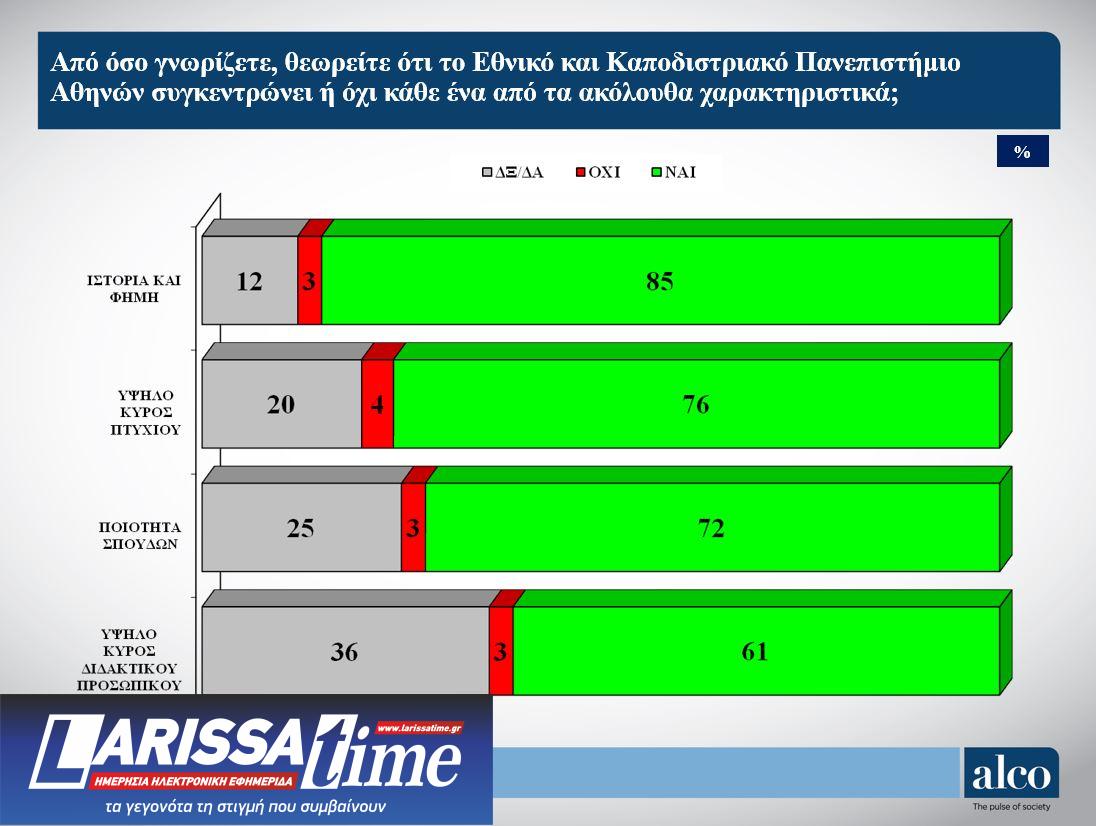 Το 85% του αναγνωρίζει ιστορία και φήμη, το 76% υψηλό κύρος πτυχίου, το 72% ποιότητα σπουδών και το 61% υψηλό κύρος διδακτικού προσωπικού. Αυτό σημαίνει ότι στο ΕΚΠΑ δεν αποδίδεται μόνο η ιστορία και η φήμη του, αλλά και όλα τα χαρακτηριστικά που όπως είδαμε στην προηγούμενη καρτέλα επιζητούν οι Κύπριοι πολίτες, δηλαδή ποιότητα σπουδών, κύρος πτυχίου και κύρος διδακτικού προσωπικού.