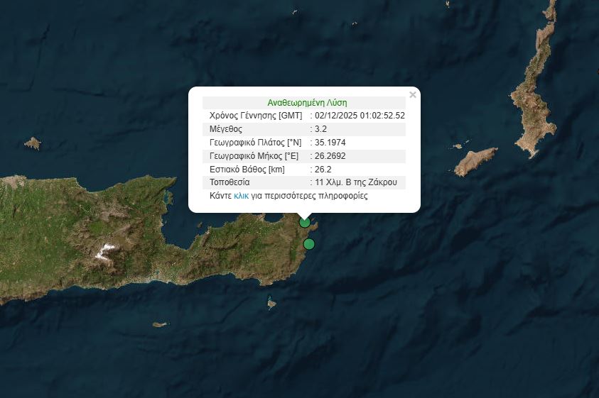 Η δεύτερη σεισμική δόνηση μεγέθους 3,2 Ρίχτερ σημειώθηκε λίγα δευτερόλεπτα αργότερα, στις 3:02:52. Το επίκεντρο του σεισμού εντοπίζεται 1 χιλιόμετρα βόρεια της Ζάκρου και το εστιακό βάθος υπολογίζεται στα 26,2 χιλιόμετρα.