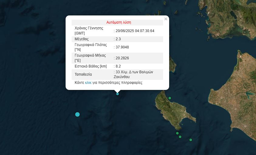 Δύο σεισμοί έγιναν ανοιχτά της Ζακύνθου πριν από λίγη ώρα. Λίγο πριν από τις 7 το πρωί έγινε ο πρώτος με μέγεθος 4,1 Ρίχτερ, σύμφωνα με την Αναθεωρημένη Λύση του Γεωδυναμικού Ινστιτούτου Αθηνών.