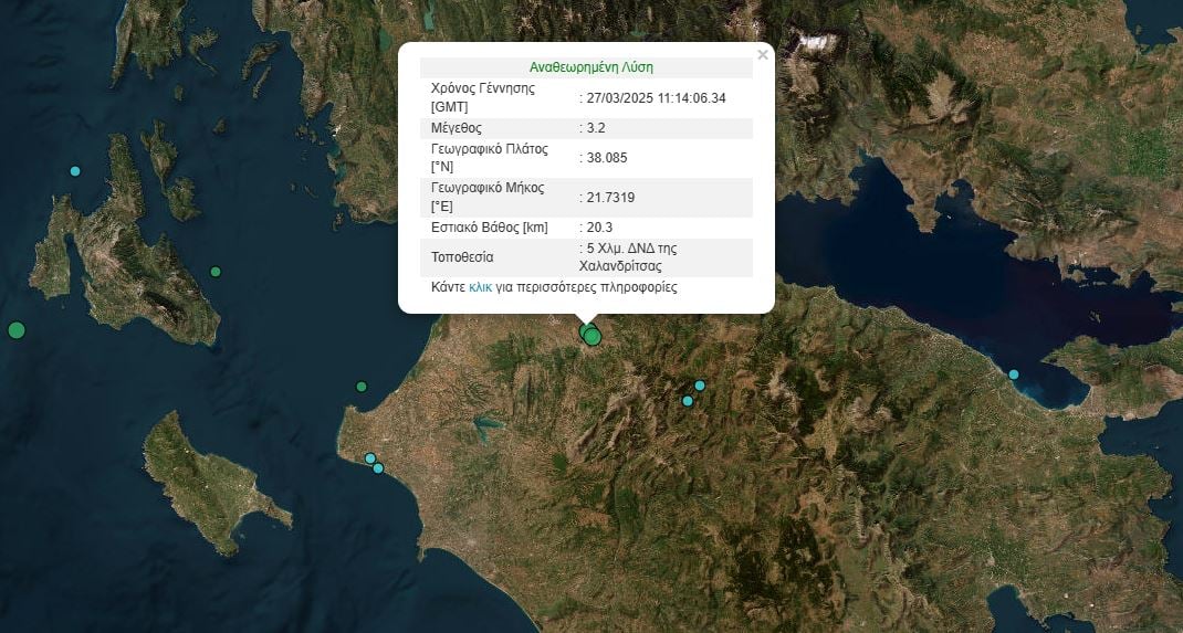 Μπαράζ σεισμικών δονήσεων σημειώνονται την τελευταία ώρα στην Αχαΐα. Ο πιο ισχυρός σεισμός έγινε, περίπου στις 13:10, και σύμφωνα το Γεωδυναμικό Ινστιτούτο του Εθνικού Αστεροσκοπείου Αθηνών, είχε μέγεθος 3,4 βαθμών της κλίμακας Ρίχτερ. Το επίκεντρο εντοπίστηκε 5 χιλιόμετρα, δυτικά, νοτιοδυτικά της περιοχής, Χαλανδρίτσα, του Δήμου Ερυμάνθου, ενώ το εστιακό βάθος υπολογίζεται σε 20 χιλιόμετρα.