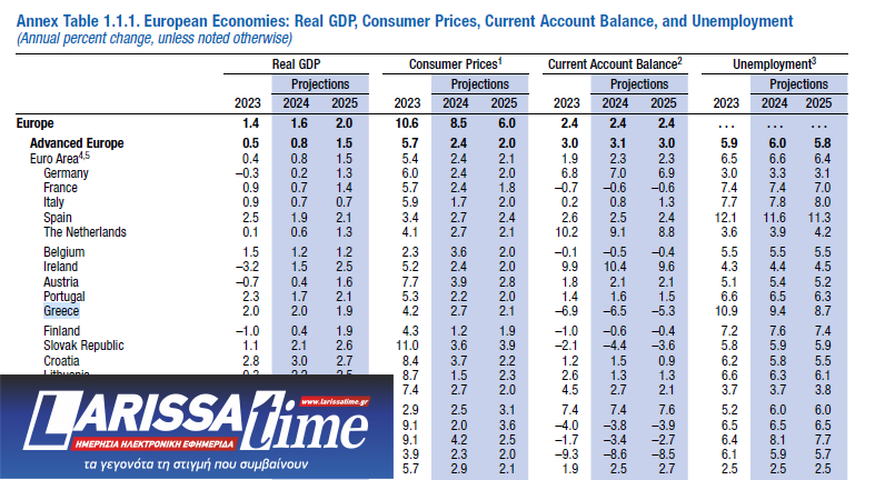 Η πρόβλεψη του ΔΝΤ είναι χαμηλότερη από αυτή που εκτιμά η Κομισιόν για την Ελλάδα, η οποία τοποθετεί την ανάπτυξη της οικονομίας στο 2,3% το 2024 και το 2025, ενώ ο πληθωρισμός βάσει του ΕνΔΤΚ αναμένεται να μειωθεί σταδιακά το 2024 και το 2025, σε 2,7% και 2% αντίστοιχα.