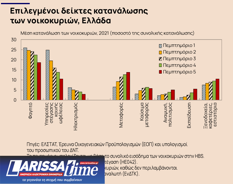 Αξίζει να σημειωθεί ότι τα νοικοκυριά του κατώτερου 20% της κλίμακας των εισοδημάτων δαπανούν πάνω από το 20% των συνολικών τους δαπανών για στέγαση, νερό, ηλεκτρικό ρεύμα, φυσικό αέριο και άλλα καύσιμα, ποσοστό υπερδιπλάσιο από το αντίστοιχο ποσοστό των νοικοκυριών του ανώτερου εισοδηματικού 20%. Αντίθετα, υπηρεσίες όπως οι μεταφορές και η διαμονή και τα εστιατόρια κατέχουν σημαντικότερη θέση στα καλάθια κατανάλωσης των ευκατάστατων νοικοκυριών.