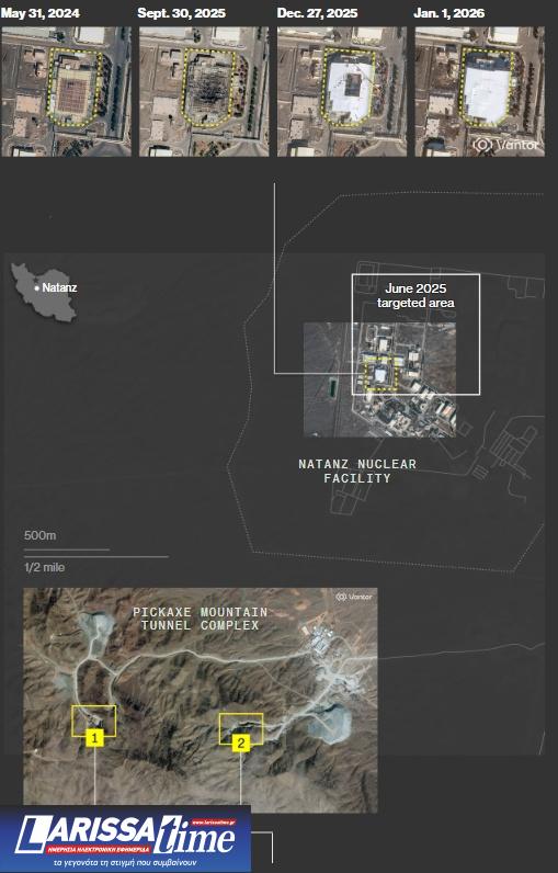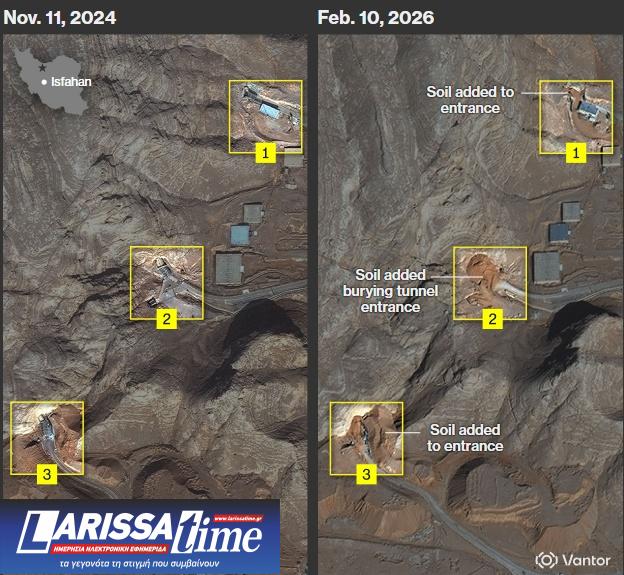 Οι εικόνες δείχνουν ότι πολλαπλές είσοδοι σηράγγων κοντά στο πυρηνικό συγκρότημα του Ισφαχάν έχουν επιχωματωθεί. Σύμφωνα με αναλυτές, η κίνηση αυτή αποσκοπεί στην αποτροπή καταρρεύσεων από αεροπορικά πλήγματα και στη σφράγιση ευάλωτων σημείων που θα μπορούσαν να αποτελέσουν στόχο διατρητικών πυρομαχικών.