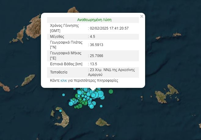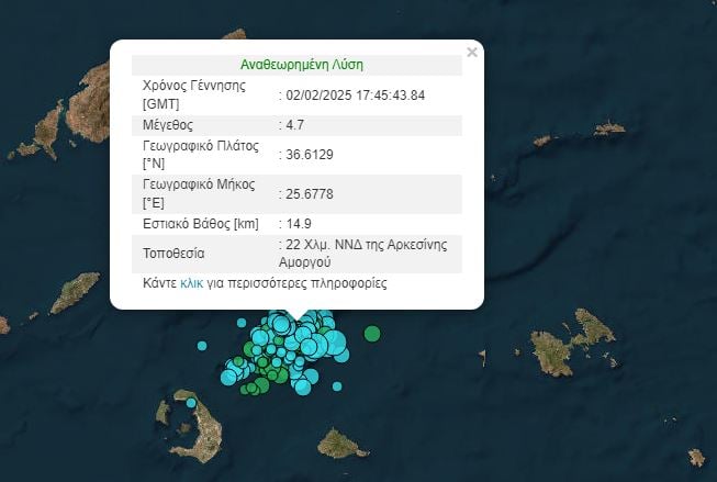 Τέσσερα λεπτά αργότερα, ακολούθησε ισχυρότερος σεισμός, 4,7 Ρίχτερ, 22 χλμ ΝΝΔ της Αρκεσίνης Αμοργού, ενώ το εστιακό βάθος υπολογίζεται στα 14,9 χιλιόμετρα.