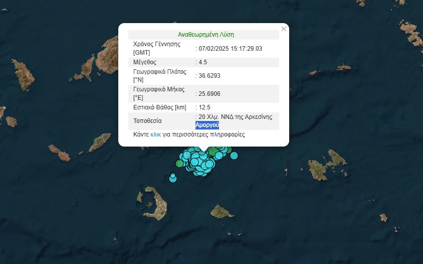 Σύμφωνα με την αναθεωρημένη λύση του Γεωδυναμικού Ινστιτούτου Αθηνών, το επίκεντρο του σεισμού 4,5 Ρίχτερ εντοπίζεται 20 χλμ. νότιο-νοτιοδυτικά της Αρκεσίνης Αμοργού και το εστιακό βάθος υπολογίζεται στα 12,5 χλμ.