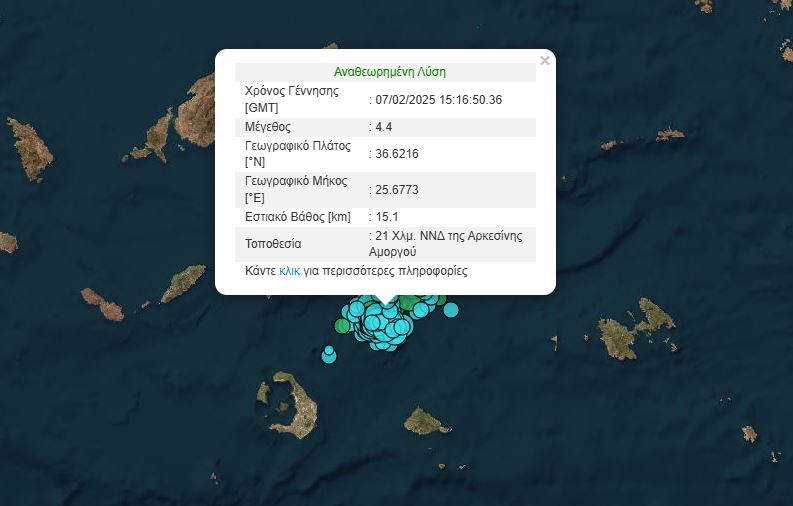 Το επίκεντρο του σεισμού 4,5 Ρίχτερ εντοπίζεται 21 χλμ. νότιο-νοτιοδυτικά της Αρκεσίνης Αμοργού και το εστιακό βάθος υπολογίζεται στα 15,1 χλμ.