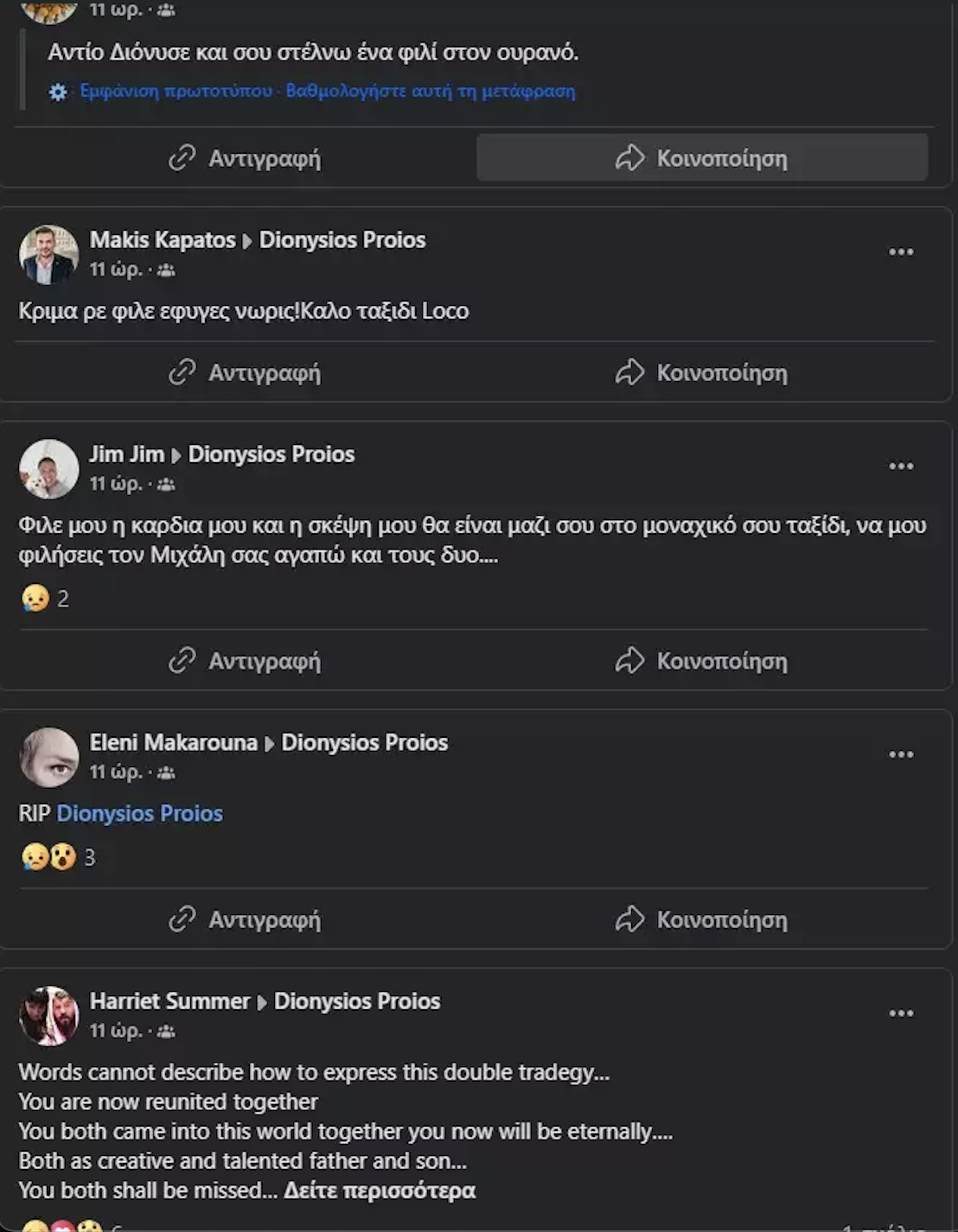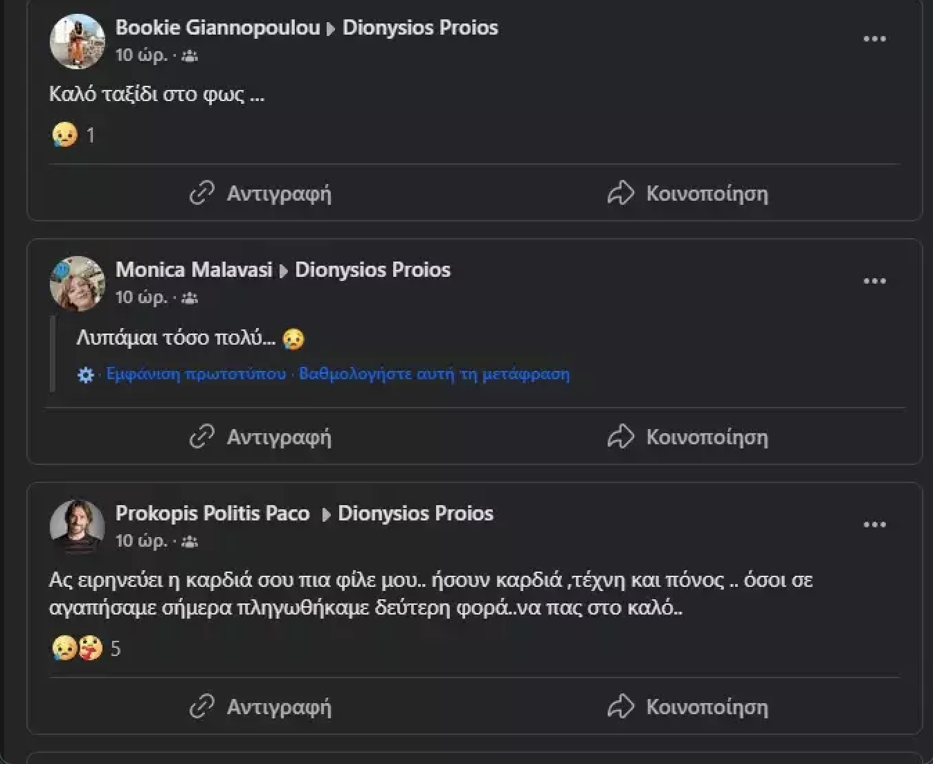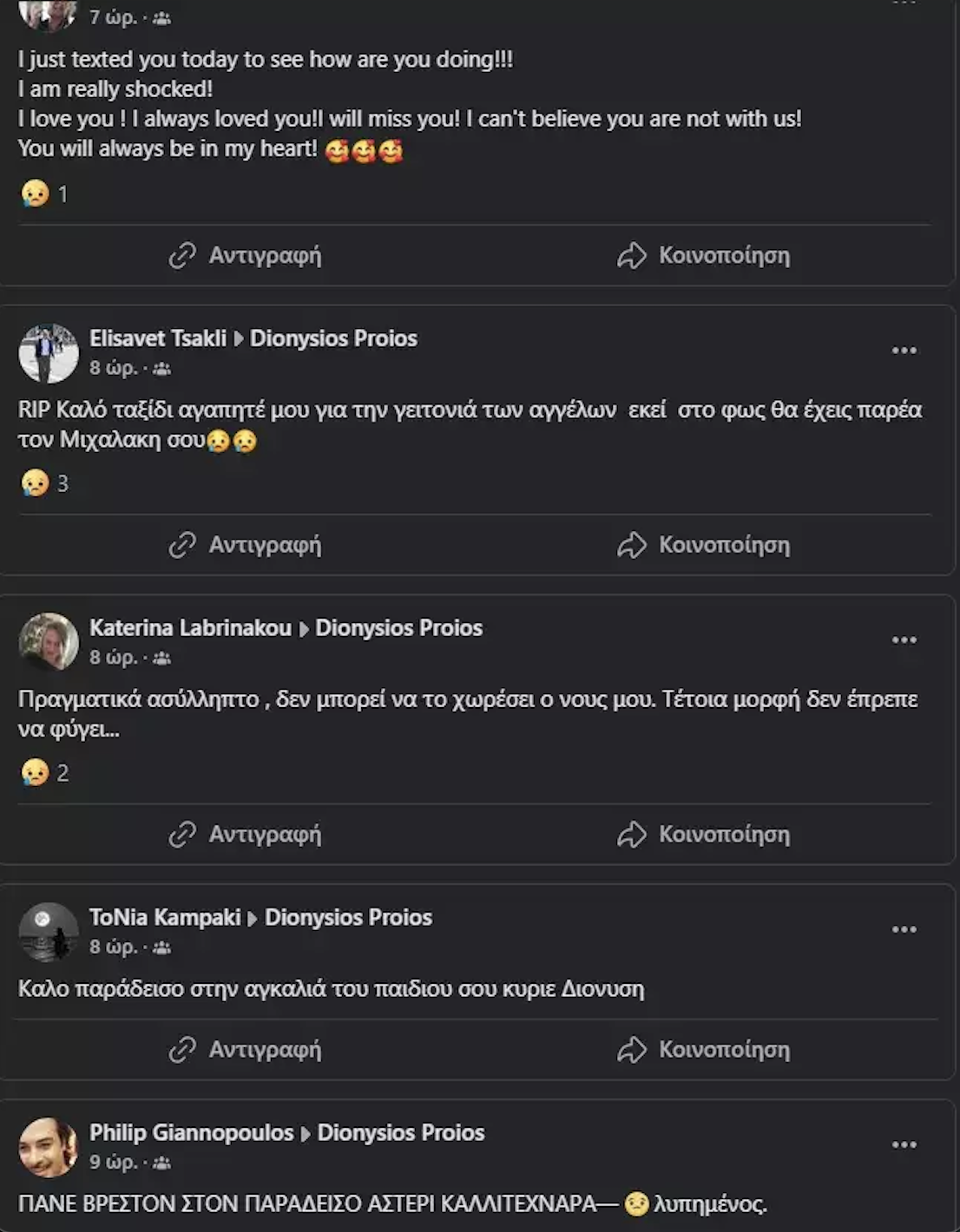 Ακολουθούν τα μηνύματα που ανάρτησαν οι φίλοι του Διονύση Πρώιου