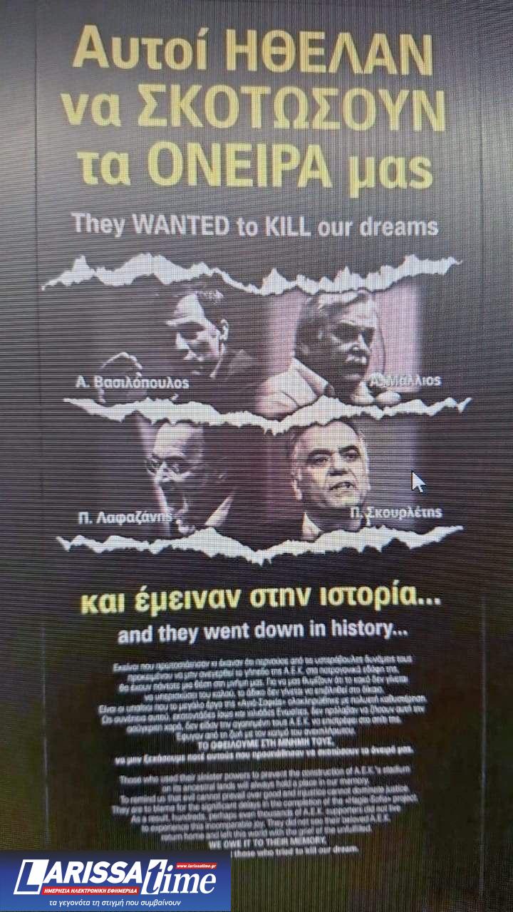 Ο λόγος για το έκθεμα που υπάρχει στο Μουσείο Ιστορίας της ΑΕΚ στην «OPAP Arena». Σε αυτό κάτω από τον τίτλο «Αυτοί ΗΘΕΛΑΝ να ΣΚΟΤΩΣΟΥΝ τα ΟΝΕΙΡΑ μας», υπάρχουν φωτογραφίες του πρώην δημάρχου Νέας Φιλαδέλφειας-Χαλκηδόνας Α. Βασιλόπουλου, του πρώην δημοτικού συμβούλου Α. Μάλλιου, και των πρώην υπουργών Π. Λαφαζάνη και Π. Σκουρλέτη.