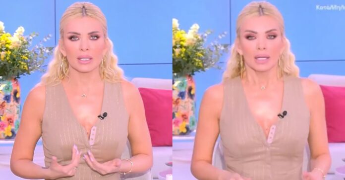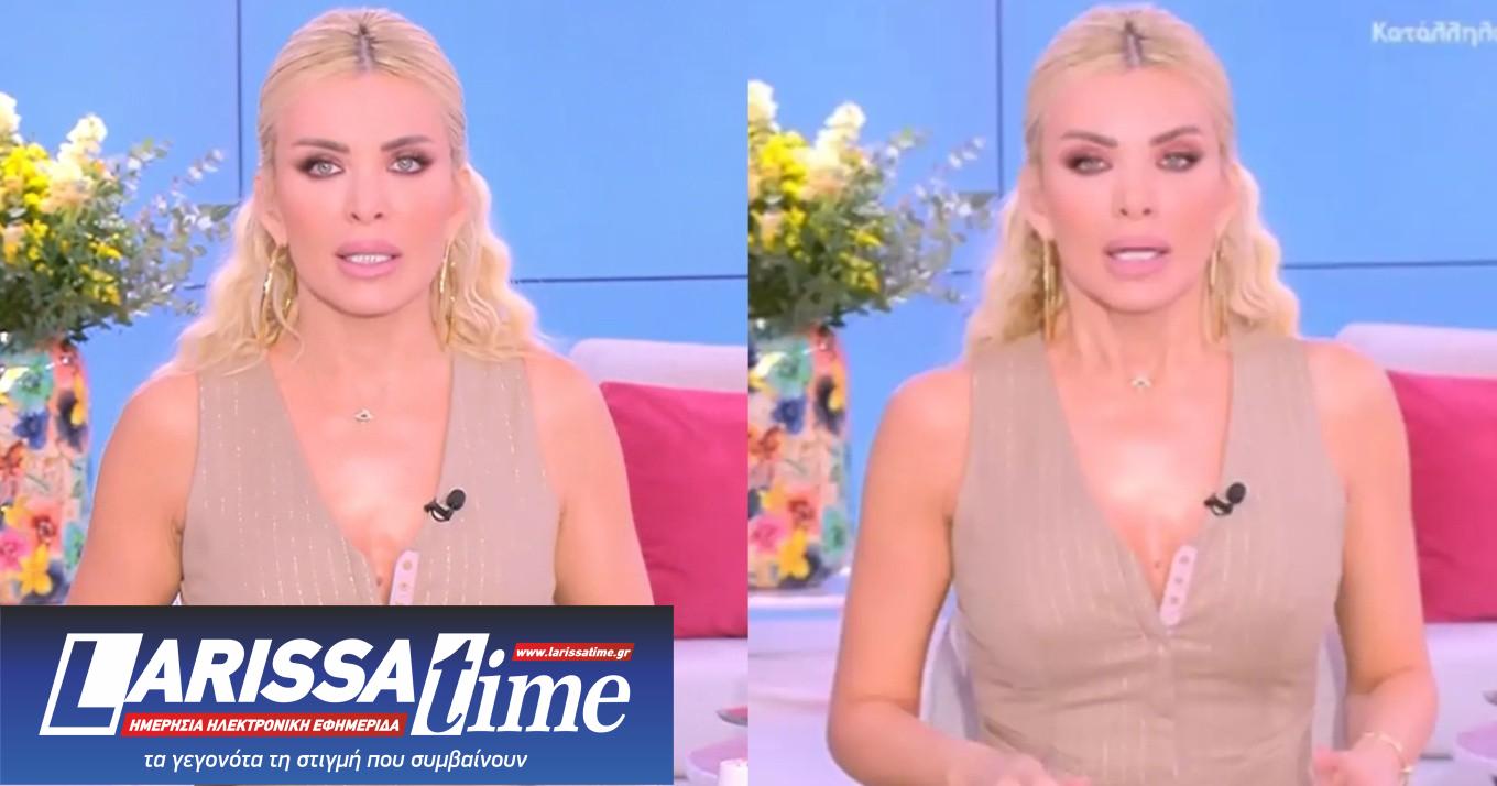 Πριν δώσει πάσα για διαφημίσεις, ενημέρωσε τους τηλεθεατές «πάω να αλλάξω λίγο, έχω τα ορμονικά μου και νομίζω ότι δεν με κολακεύει αυτό που φοράω» και μετά το διαφημιστικό διάλειμμα, επέστρεψε με το νέο ντύσιμο.