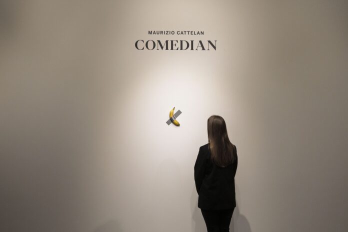 Το έργο αποτελείται από μια μπανάνα κολλημένη σε ένα τοίχο με ένα χοντρό κομμάτι ασημί ταινίας. Τιτλοφορείται “Comedian” και δημιουργήθηκε από τον εικονοκλάστη και προβοκάτορα ιταλό καλλιτέχνη Μαουρίτσιο Κατελάν.