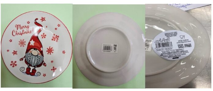 Πιάτο από πορσελάνη με χριστουγεννιάτικη διακόσμηση, προέλευσης Κίνας, στο οποίο διαπιστώθηκαν αυξημένα επίπεδα απελευθέρωσης καδμίου, ανακαλεί από την αγορά ο Ενιαίος Φορέας Ελέγχου Τροφίμων.