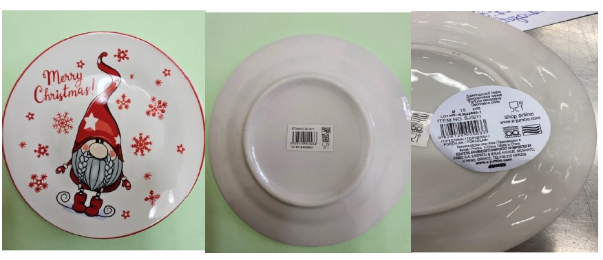 Πρόκειται για πιάτο από πορσελάνη με χριστουγεννιάτικη διακόσμηση 15 cm, με κωδικό προϊόντος ITEM NO: SJ0211, αριθμό γραμμοκώδικα 0526126000033 και αριθμό παρτίδας SJB23022-1, το οποίο διακινείται από την εταιρεία «JUMBO ΑΝΩΝΥΜΗ ΕΜΠΟΡΙΚΗ ΕΤΑΙΡΕΙΑ».