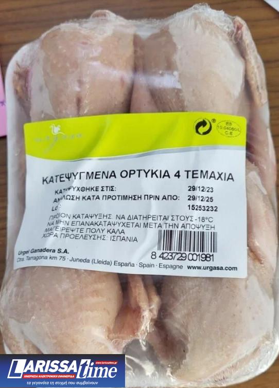 «Ο Ε.Φ.Ε.Τ. και ειδικότερα η Περιφερειακή Διεύθυνση Ηπείρου, κατά τη διενέργεια Ελέγχων στο πλαίσιο του Προγράμματος «Επίσημος Έλεγχος για την παρακολούθηση Μικροβιολογικών Κριτηρίων Ασφάλειας Τροφίμων» έτους 2024, προέβη σε δειγματοληψία κατεψυγμένου κρέατος ορτυκιού, με την εμπορική ονομασία “ΚΑΤΕΨΥΓΜΕΝΑ ΟΡΤΥΚΙΑ 4 ΤΕΜΑΧΙΑ” με αριθμό παρτίδας LOT:15253232, ημερομηνία κατάψυξης 29/12/2023 και ημερομηνία ανάλωσης κατά προτίμηση 29/12/2025, τo οποίο παράγεται στην Ισπανία από την Επιχείρηση Urgel Ganadera S.A.. Σε συνέχεια εργαστηριακών δοκιμών από το Κτηνιατρικό Εργαστήριο Ιωαννίνων και το Κτηνιατρικό Εργαστήριο Χαλκίδας, διαπιστώθηκε η παρουσία του παθογόνου μικροοργανισμού Salmonella Typhimurium.