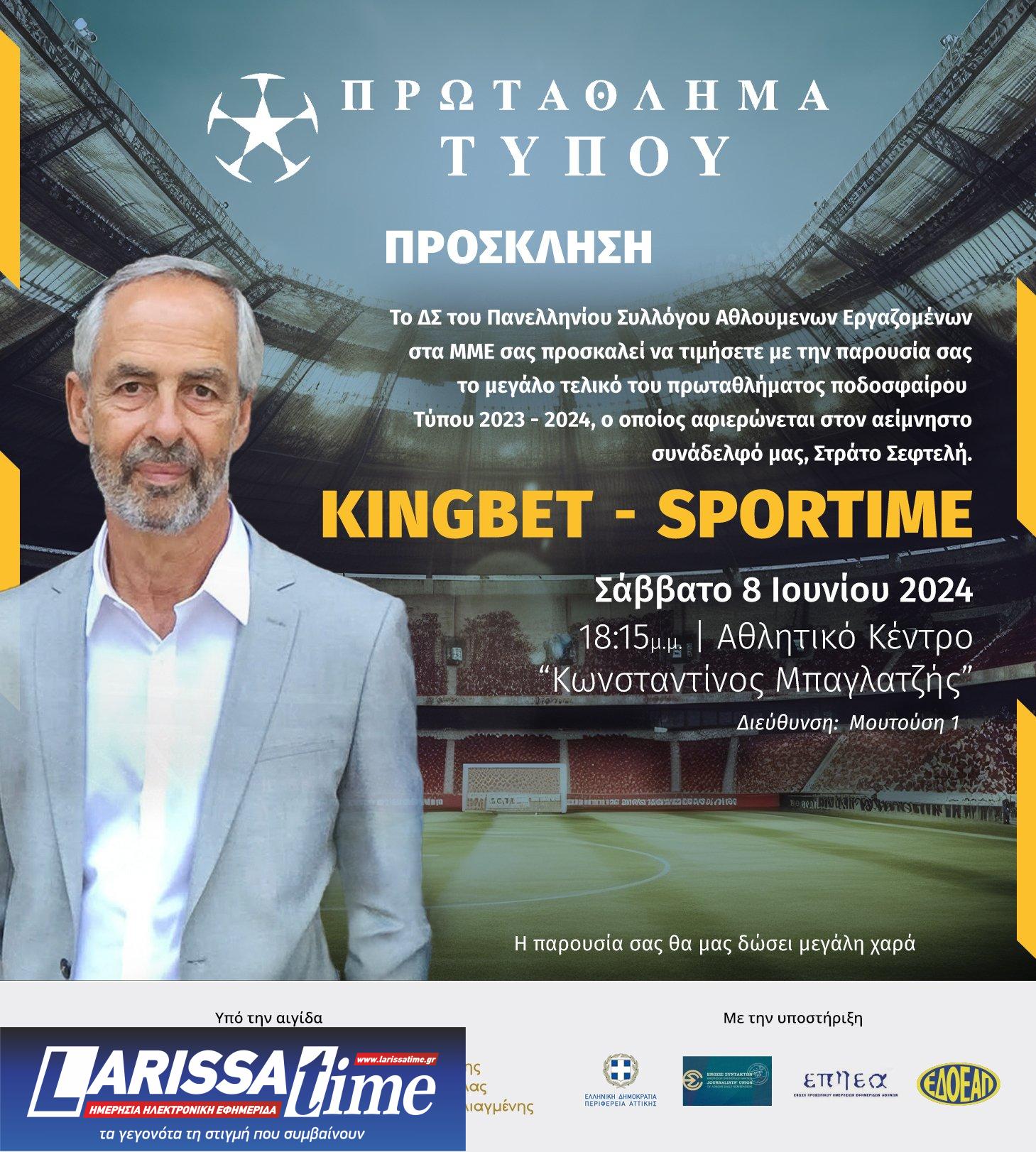 Όπως ανακοίνωσε ο Πανελλήνιος Σύλλογος Αθλουμένων Εργαζομένων στα ΜΜΕ (ΠΣΑΕ ΜΜΕ), το ερχόμενο Σάββατο, 8 Ιουνίου (18:15), διεξάγεται στο Αθλητικό Κέντρο Βάρης «Κωνσταντίνος Μπαγλατζής» ο μεγάλος τελικός του Πρωταθλήματος Τύπου, στον οποίο θα τεθούν αντιμέτωπες οι ομάδες της Kingbet και του Sportime.