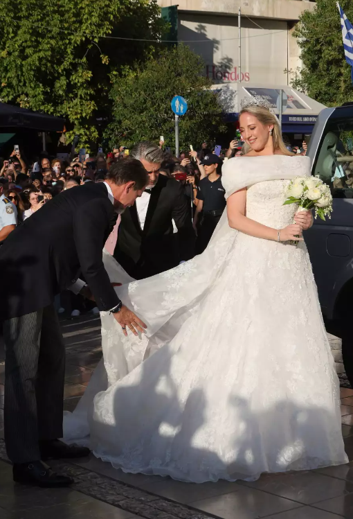 Η Θεοδώρα κατέφθασε στην εκκλησία συνοδευόμενη από τον αδελφό της, Παύλο, φορώντας ένα εκπληκτικό νυφικό της διεθνούς φήμης Ελληνίδας σχεδιάστριας Σήλιας Κριθαριώτη, η οποία είναι αγαπημένη επιλογή της μητέρας της, Άννας-Μαρίας, για τις επίσημες εμφανίσεις της. Η νύφη ολοκλήρωσε το εντυπωσιακό της σύνολο με μια τιάρα από τον οίκο Cartier, η οποία έχει πλούσια ιστορία. Η συγκεκριμένη τιάρα ήταν γαμήλιο δώρο από τον Χεδίβη της Αιγύπτου στην πριγκίπισσα Μαργαρίτα του Connaught, εγγονή της βασίλισσας Βικτωρίας, στο γάμο της με τον Γουσταύο VI της Σουηδίας.