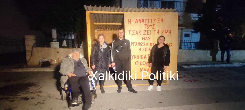 Από τα Ν. Μουδανιά, ο δήμος δέχτηκε να μεταφερθεί ένα ξύλινο σπιτάκι έξω από το σπίτι του κ. Θεόφιλου όπου θα περάσεις τις επόμενες μέρες και νύχτες, εμμένοντας στη θέση του ότι δεν φεύγει από την περιουσία του. Οι γείτονες σε ένδειξη συμπαράστασης έβγαλαν προσωρινά μικροέπιπλα και έναν καναπέ για να ξαπλώσει ο 82χρονος.