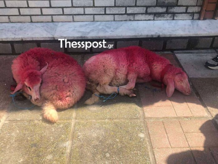 Αρνητική εντύπωση προκάλεσαν οι εικόνες που καταγράφηκαν σήμερα έξω από την εκκλησία του Αγίου Γεωργίου στο Καλοχώρι Θεσσαλονίκης, όπου δύο αρνάκια ήταν βαμμένα με κόκκινη μπογιά και δεμένα.