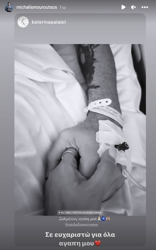 Ακολούθησε η ανάρτηση της συντρόφου του, η οποία δημοσίευσε επίσης ένα στιγμιότυπο μέσα από το νοσοκομείο, στο οποίο κρατάει το χέρι του αγαπημένου της και υπογραμμίζει «Σιδερένιος αγάπη μου», με εκείνον να κάνει repost και να απαντά «Σ’ ευχαριστώ για όλα αγάπη μου».