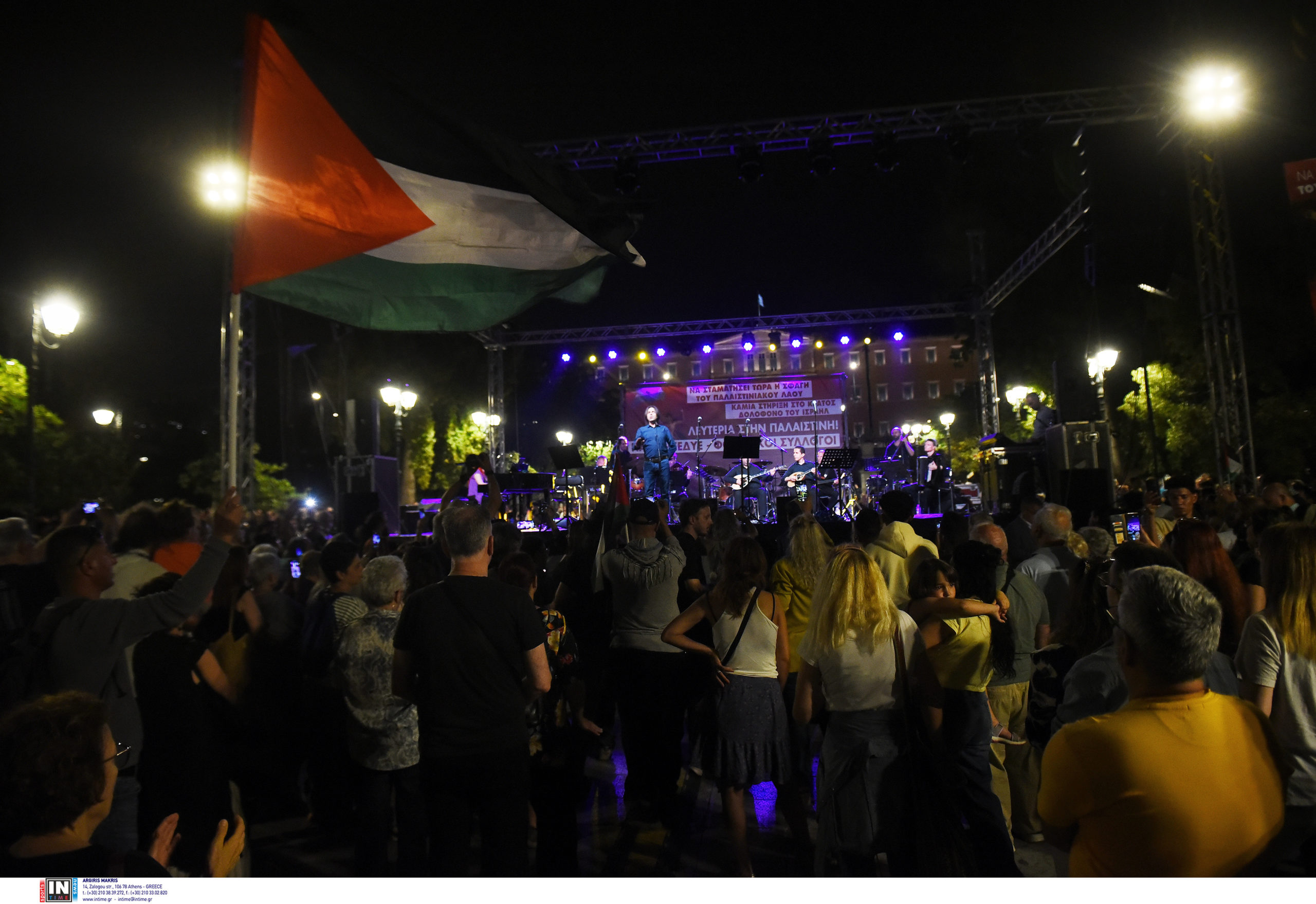 Το σύνθημα «Λευτεριά στη Παλαιστίνη» δονεί διαρκώς την ατμόσφαιρα στη πλατεία Συντάγματος στη αποψινή συναυλία αλληλεγγύης στον Παλαιστινιακό λαό.