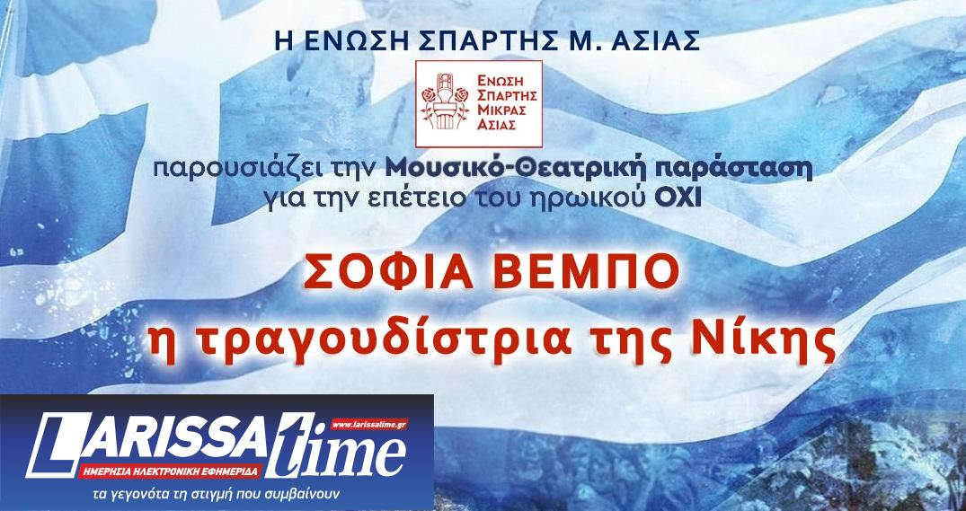 Την Τετάρτη 29 Οκτωβρίου στις 7.30μμ με ελεύθερη είσοδο, θα πραγματοποιηθεί η μουσικοθεατρική παράσταση με θέμα «Σοφία Βέμπο – Η τραγουδίστρια της Νίκης». Η εκδήλωση διοργανώνεται από την «Ένωση Σπάρτης Μικράς Ασίας», στο πνευματικό της κέντρο (Αλατσάτων 27 – Νέα Ιωνία Αττικής, κοντά στον ΗΣΑΠ).