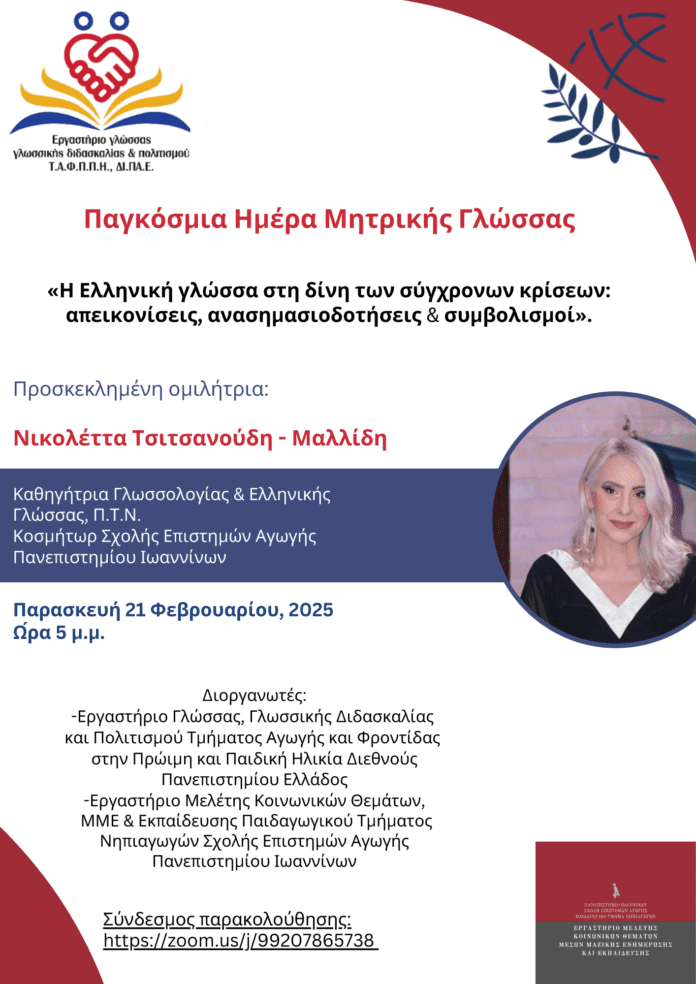 Στην εκδήλωση θα μιλήσει η Καθηγήτρια Γλωσσολογίας και Ελληνικής Γλώσσας του Π.Τ.Ν. και Κοσμήτωρ της Σχολής Επιστημών Αγωγής κ. Νικολέττα Τσιτσανούδη Μαλλίδη, με θέμα «Η ελληνική γλώσσα στη δίνη των κρίσεων: απεικονίσεις, ανασημασιοδοτήσεις και συμβολισμοί». Την εκδήλωση θα προλογίσει η Διευθύντρια του Εργαστηρίου Γλώσσας, Γλωσσικής Διδασκαλίας και Πολιτισμού, Καθηγήτρια Διδακτικής της Νεοελληνικής Γλώσσας κ. Σμαράγδα Παπαδοπούλου. Χαιρετισμό θα απευθύνει η πρόεδρος του Τμήματος Αγωγής και Φροντίδας στην Πρώιμη Παιδική Ηλικία του Διεθνούς Πανεπιστημίου της Ελλάδος, Καθηγήτρια κ. Μαρία Τσιτιρίδου.