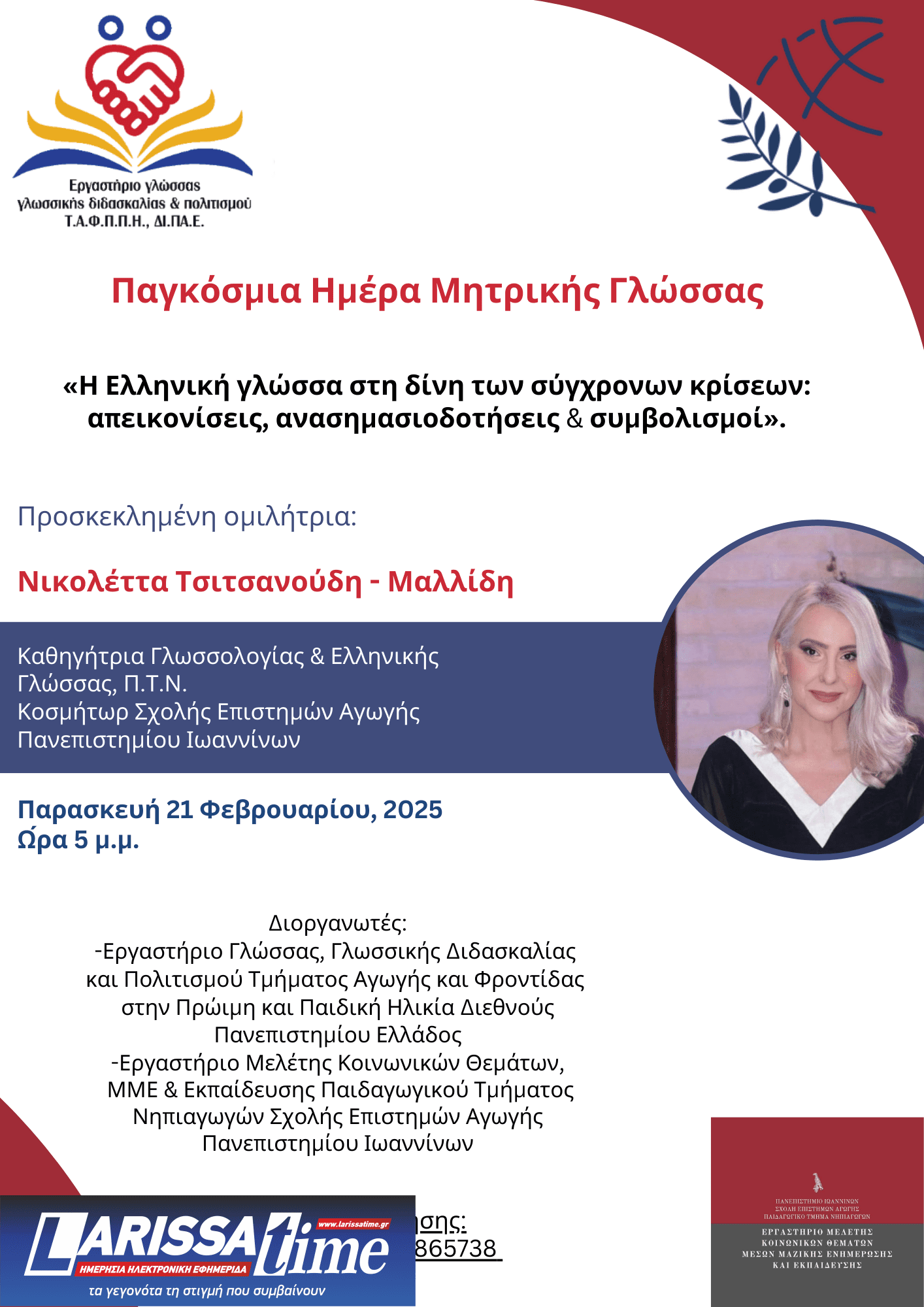 Το Εργαστήριο Μελέτης Κοινωνικών Θεμάτων, ΜΜΕ και Εκπαίδευσης του Παιδαγωγικού Τμήματος Νηπιαγωγών της Σχολής Επιστημών Αγωγής του Πανεπιστημίου Ιωαννίνων και το Εργαστήριο Γλώσσας, Γλωσσικής Διδασκαλίας και Πολιτισμού του Τμήματος Αγωγής και Φροντίδας στην Πρώιμη Παιδική Ηλικία του Διεθνούς Πανεπιστημίου της Ελλάδος οργανώνουν σήμερα Παρασκευή 21 Φεβρουαρίου και ώρα 5 μ.μ. αφιέρωμα στην Παγκόσμια Ημέρα Μητρικής Γλώσσας.