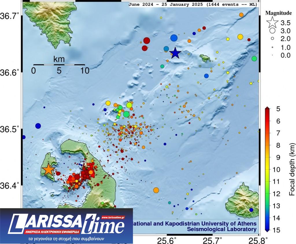 Κατά τη σεισμική ακολουθία του 2024, τα μικροσεισμικά επίκεντρα στη Σαντορίνη εντοπίστηκαν κυρίως στη Νέα Καμένη και την ευρύτερη περιοχή Ημεροβιγλίου – Φηρών, κατά μήκος της «γραμμής Καμένης» με διεύθυνση ΒΑ-ΝΔ. Συγχρόνως, εμφανίστηκε μικροσεισμική δραστηριότητα στην περιοχή ανατολικά του Κολούμπο, η οποία είχε ενεργοποιηθεί και κατά την περίοδο 2011-2012. Συνολικά, από τον Ιούνιο του 2024 έως και τις 25 Ιανουαρίου 2025 εντοπίστηκαν με τη χρήση τεχνητής νοημοσύνης πάνω από 1,600 σεισμοί στην περιοχή Σαντορίνης-Κολούμπο (Σχήμα 2), με μεγαλύτερο εκείνον που εκδηλώθηκε στις 25 Ιανουαρίου, 08:57:25 ώρα Ελλάδος, με επίκεντρο στις NA ακτές της Θηρασιάς, με μέγεθος 3.8.
