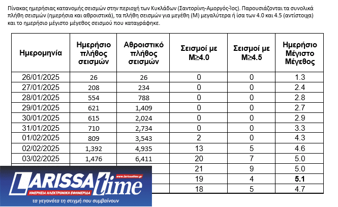 Στις 4 Φεβρουαρίου καταγράφηκαν πάνω από 1,300 σεισμοί με Μ≥1.0 (συγκριτικά λιγότεροι απ’ ότι στις 3 Φεβρουαρίου που καταγράφηκαν ~1,450 σεισμοί με Μ≥1.0). Το μέγιστο μέγεθος έφτασε το 4.9-5.0, ενώ εκδηλώθηκαν 21 σεισμοί με μεγέθη Μ≥4.0 και 9 σεισμοί με Μ≥4.5. Η κατανομή των σεισμικών επικέντρων στις 4 Φεβρουαρίου ήταν παρόμοια με εκείνη της 3ης Φεβρουαρίου, με τους περισσότερους σεισμούς να εντοπίζονται πλησίον της Ανύδρου. Η εικόνα έγινε ευκρινέστερη προς το τέλος της ημέρας, όταν τα επίκεντρα ευθυγραμμίστηκαν σε διεύθυνση ΝΔ-ΒΑ στα νοτιοδυτικά της Ανύδρου. Μέρος της δραστηριότητας διαχέεται βόρεια της Ανύδρου με περισσότερο διάσπαρτα επίκεντρα. Από τις 26 Ιανουαρίου μέχρι και τις 4 Φεβρουαρίου, ο αριθμός σεισμών που ανιχνεύθηκαν ξεπέρασε τους 7,700 (Σχήμα 3), εκ των οποίων πάνω από 6,100 είχαν μέγεθος Μ≥1.0 και πάνω από 1,200 είχαν μέγεθος Μ≥2.5.