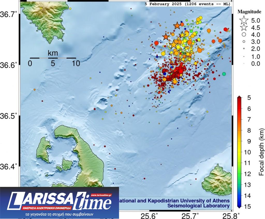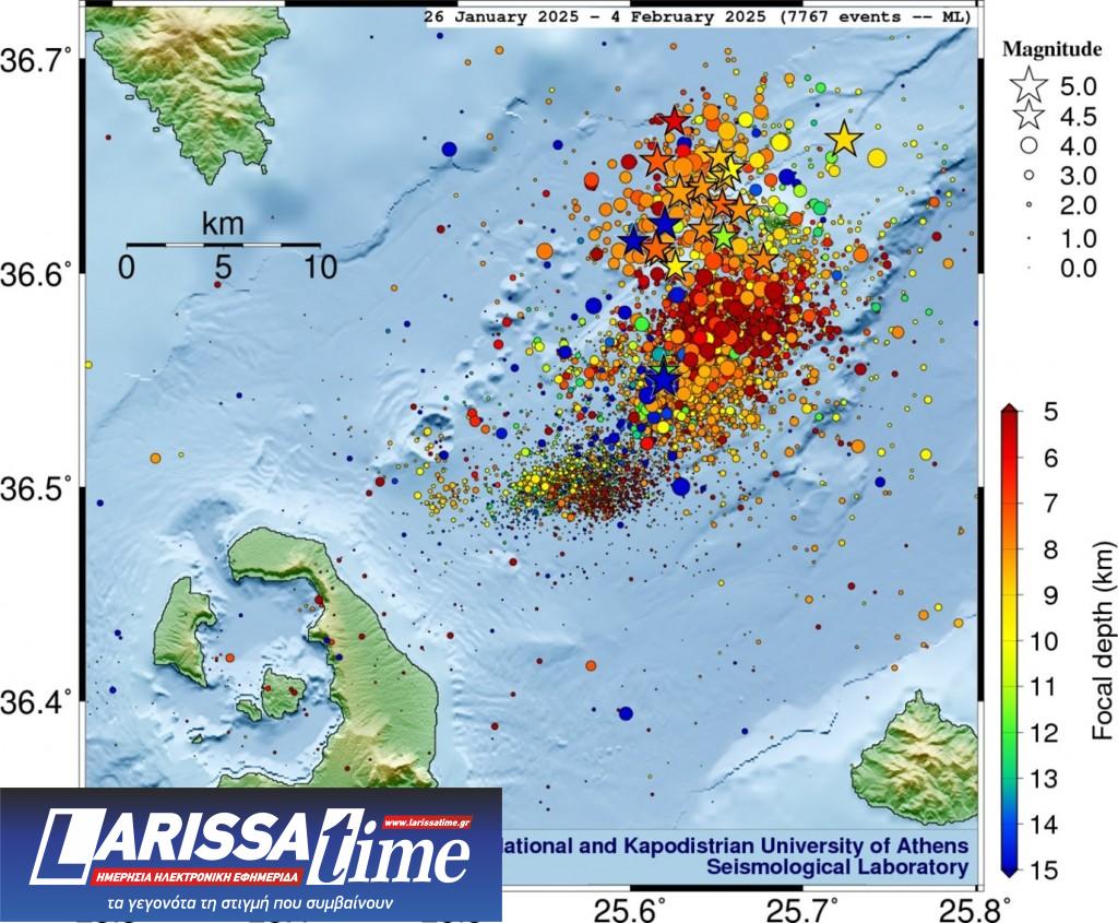 Σύμφωνα με τα στοιχεία καθημερινής ανάλυσης σεισμικών δεδομένων του Εργαστηρίου Σεισμολογίας του ΕΚΠΑ, κατά την 6η Φεβρουαρίου έχουν καταγραφεί πάνω από 110 σεισμοί, εκ των οποίων 18 με μεγέθη M≥4.0 και 5 με Μ≥4.5, ενώ ο μεγαλύτερος σεισμός είχε μέγεθος 4.7, με τους περισσότερους σεισμούς να σημειώνονται νοτιοδυτικά της Ανύδρου, και ελάχιστους βορειοανατολικά. Τα στοιχεία των τελευταίων ημερών δείχνουν ότι, αν και συνεχίζει να εμφανίζεται μεγάλο πλήθος σεισμών με Μ³4.0, ο ρυθμός σεισμικότητας παρουσιάζει μια σχετική μείωση, ως προς τους σεισμούς που εντοπίζονται τόσο με συμβατικές μεθόδους όσο και με μεθόδους τεχνητής νοημοσύνης.