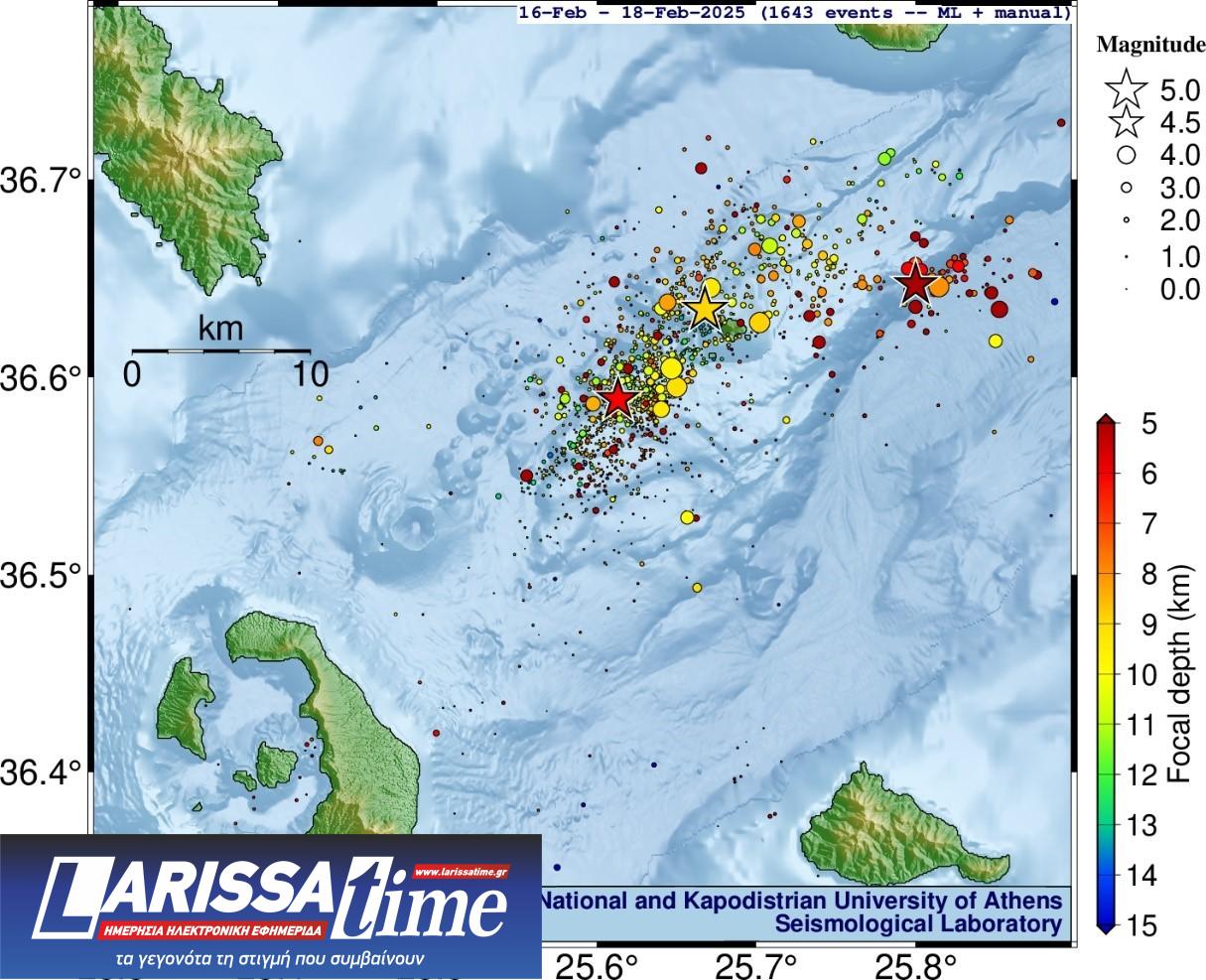 «Από την έναρξη της σεισμικής δραστηριότητας στη ζώνη Σαντορίνης-Αμοργού στις 26 Ιανουαρίου έως και τις 17 Φεβρουαρίου 2025, το Εργαστήριο Σεισμολογίας (ΕΣ) του ΕΚΠΑ (http://dggsl.geol.uoa.gr/) έχει ανιχνεύσει και εντοπίσει συνολικά, με αυστηρά κριτήρια για τη διασφάλιση της ποιότητας των αποτελεσμάτων, πάνω από 21,500 σεισμούς με μεθόδους μηχανικής μάθησης (τεχνητής νοημοσύνης), εκ των οποίων άνω των 18,600 με μεγέθη Μ³1.0. Στις 16 Φεβρουαρίου καταγράφηκαν πάνω από 770 σεισμοί, με 26 να έχουν μέγεθος Μ³2.5, δύο (2) σεισμούς με Μ³4.0, και κανέναν (0) με Μ³4.5, με τον ισχυρότερο σεισμό να έχει μέγεθος 4.4 (22:56:00, τοπική ώρα). Στις 17 Φεβρουαρίου καταγράφηκαν πάνω από 780 σεισμοί, με 48 να έχουν μέγεθος Μ³2.5, τέσσερις (4) σεισμούς με Μ³4.0, και έναν (1) με Μ³4.5, με τον ισχυρότερο σεισμό μεγέθους 5.1 να καταγράφεται στις 09:49:51 (τοπική ώρα). Σύμφωνα με τα στοιχεία καθημερινής ανάλυσης σεισμικών δεδομένων (χωρίς χρήση μεθόδων μηχανικής μάθησης) του Εργαστηρίου Σεισμολογίας του ΕΚΠΑ, κατά την 18η Φεβρουαρίου έχουν καταγραφεί 95 σεισμοί, εκ των οποίων τρεις (3) με μέγεθος M≥4.0, και δύο (2) με μέγεθος Μ³4.5, με τους δύο ισχυρότερους σεισμούς, μεγέθους 4.9, να σημειώνονται στις 06:46:53 και 08:08:09 (τοπική ώρα).