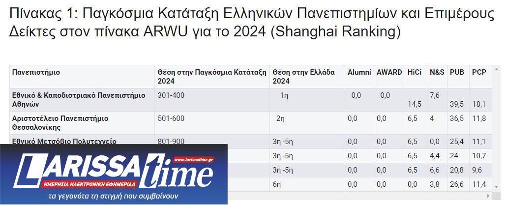 – Στην 1η θέση στην Ελλάδα μεταξύ των έξι Πανεπιστημίων που βρίσκονται στο top 1000, και μάλιστα συγκεντρώνοντας τον υψηλότερο βαθμό σε όλα τα επιμέρους κριτήρια στα οποία έλαβαν βαθμό τα Ελληνικά Πανεπιστήμια (Βλέπε Πίνακα 2).