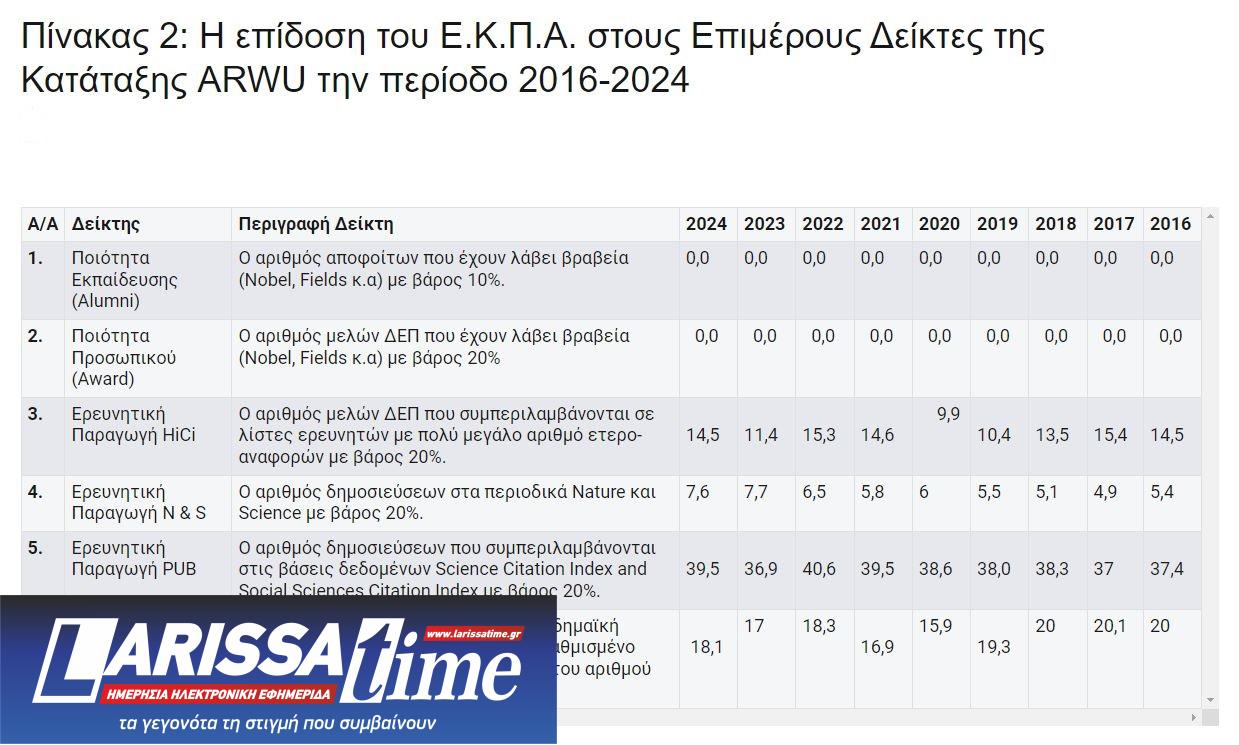 - Δείκτης HiCi: Ο αριθμός μελών ΔΕΠ που συμπεριλαμβάνονται σε λίστες ερευνητών με πολύ μεγάλο αριθμό ετερο-αναφορών με βάρος 20%,