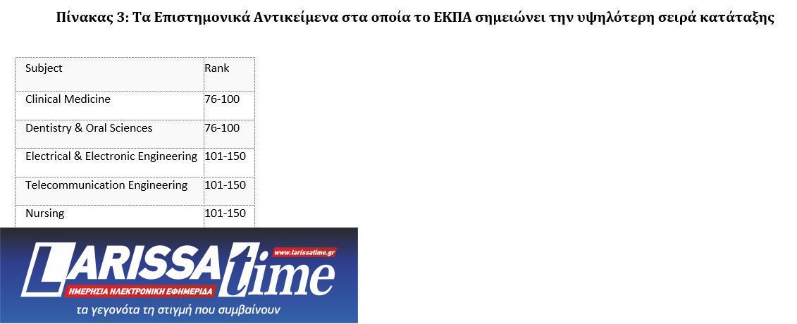 Ειδικότερα, όσον αφορά την κατάταξη με βάση τα Επιστημονικά Αντικείμενα (Academic Subjects), το ΕΚΠΑ βρίσκεται στις θέσεις 76-100 στα πεδία της Κλινικής Ιατρικής, και της Οδοντιατρικής, στις θέσεις 101-150 στα πεδία της Ηλεκτρολογικής και Ηλεκτρονικής Μηχανικής, Μηχανικής Τηλεπικοινωνιών, και της Νοσηλευτικής και στις θέσεις 151-200 στα πεδία της Φυσικής, της Δημόσιας Υγείας, και των Επιστημών της Βιολογίας του Ανθρώπου (Βλέπε Πίνακα 3):