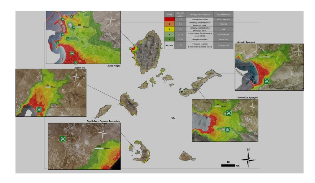 Στον παρακάτω χάρτη με επιλεγμένες περιοχές των Κυκλάδων, αποτυπώνεται η συσχέτιση των ευάλωτων ζωνών σε επιπτώσεις τσουνάμι με τις θέσεις των σημείων συγκέντρωσης που έχουν υποδείξει οι τοπικοί δήμοι. Οι περιοχές που σημειώνονται με κόκκινο χρώμα είναι οι πλέον ευάλωτες και δεν ενδείκνυται η τοποθέτηση σημείων συγκέντρωσης σε αυτές.