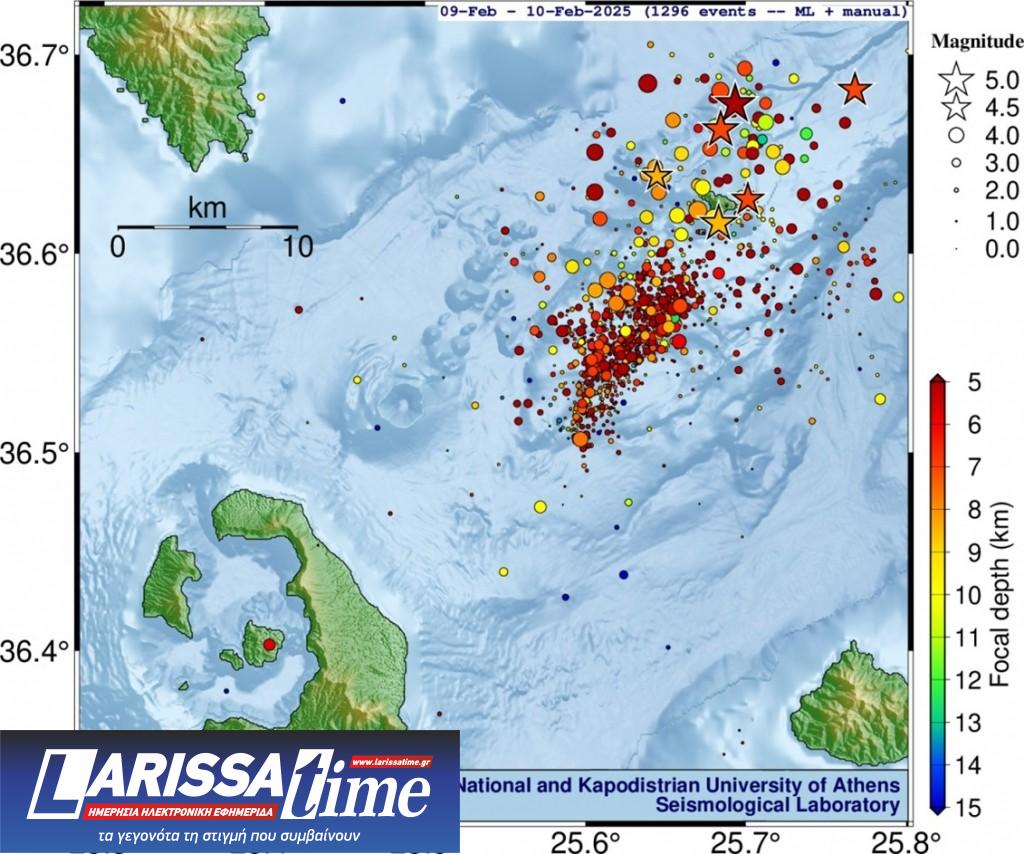 Από την έναρξη της σεισμικής δραστηριότητας στη ζώνη Σαντορίνης-Αμοργού στις 26 Ιανουαρίου έως και τις 9 Φεβρουαρίου 2025, το Εργαστήριο Σεισμολογίας (ΕΣ) του ΕΚΠΑ (http://dggsl.geol.uoa.gr/) έχει ανιχνεύσει και εντοπίσει συνολικά, με αυστηρά κριτήρια για τη διασφάλιση της ποιότητας των αποτελεσμάτων, πάνω από 14,000 σεισμούς με μεθόδους μηχανικής μάθησης (τεχνητής νοημοσύνης), εκ των οποίων περίπου 12,000 με μεγέθη Μ≥1.0. Στις 9 Φεβρουαρίου καταγράφηκαν πάνω από 1,100 σεισμοί, με ~240 να έχουν μέγεθος Μ≥2.5, 14 σεισμούς με Μ≥4.0, και 2 σεισμούς με Μ≥4.5, με τον μεγαλύτερο σεισμό να έχει μέγεθος M=5.0.