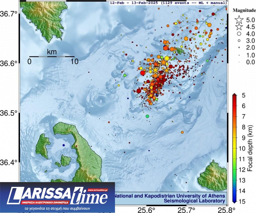 Από την έναρξη της σεισμικής δραστηριότητας στη ζώνη Σαντορίνης-Αμοργού στις 26 Ιανουαρίου έως και τις 12 Φεβρουαρίου 2025, το Εργαστήριο Σεισμολογίας (ΕΣ) του ΕΚΠΑ έχει ανιχνεύσει και εντοπίσει συνολικά πάνω από 17,500 επιλεγμένους σεισμούς με μεθόδους μηχανικής μάθησης (τεχνητής νοημοσύνης), εκ των οποίων άνω των 15,400 με μεγέθη Μ≥1.0. Στις 12 Φεβρουαρίου καταγράφηκαν πάνω από 1,000 σεισμοί, με ~190 να έχουν μέγεθος Μ≥2.5, 16 σεισμούς με Μ≥4.0, και 5 σεισμούς με Μ≥4.5, με τον μεγαλύτερο σεισμό να έχει μέγεθος 5.0.