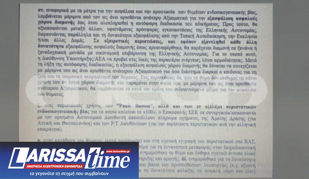 Στο έγγραφο επίσης αναφέρεται ότι σε περίπτωση που λήξει η αυτόφωρη διαδικασία αναζήτησης του δράστη, θα πρέπει να εξασφαλιστεί ασφαλές χώρος διαμονής των θυμάτων ενδοοικογενειακής βίας για όσο διάστημα διαρκεί ο κίνδυνος.