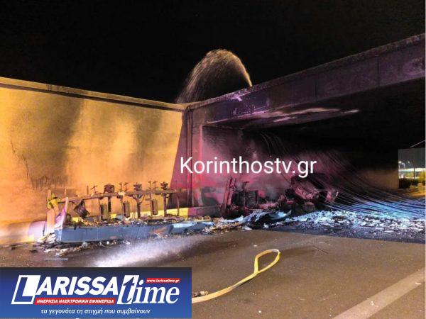 Το βράδυ χθες Παρασκευή ξέσπασε φωτιά στο 75,5ο χλμ της Αθηνών-Κορίνθου, στο ύψος της γέφυρας του Ισθμού, έπειτα από ανατροπή βυτιοφόρου.